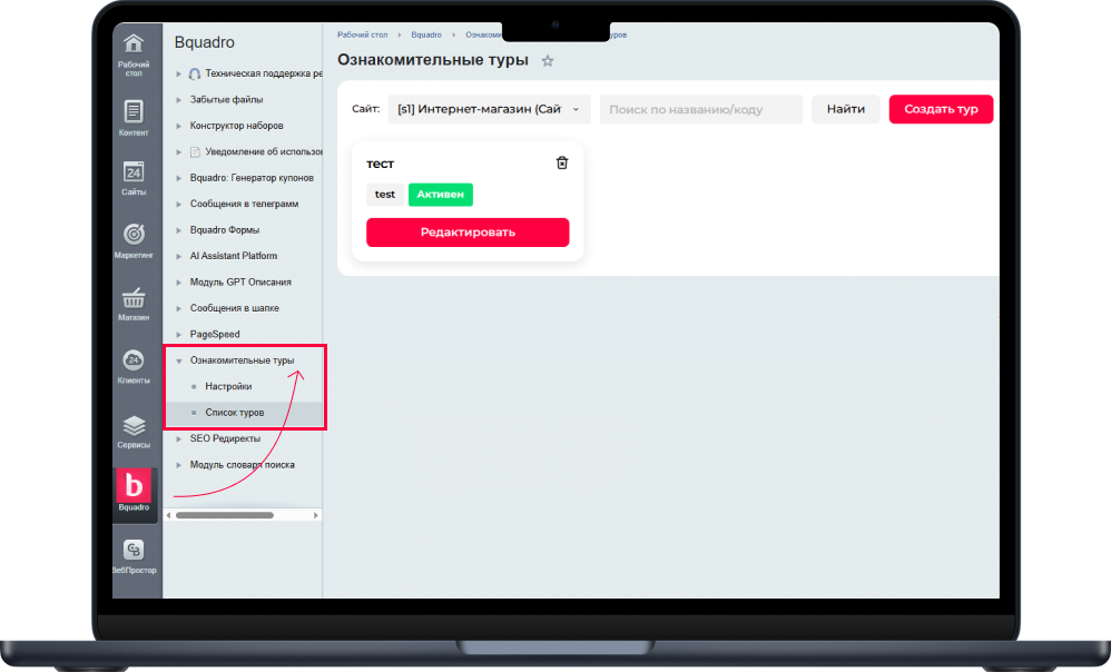 Создание туров и шагов внутри них осуществляется из соответствующего раздела административной панели: Bquadro > Ознакомительные туры > Список туров.