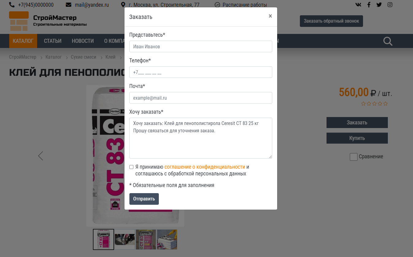 - Формы: Заказать товар, Заказать звонок, Заявка на аренду