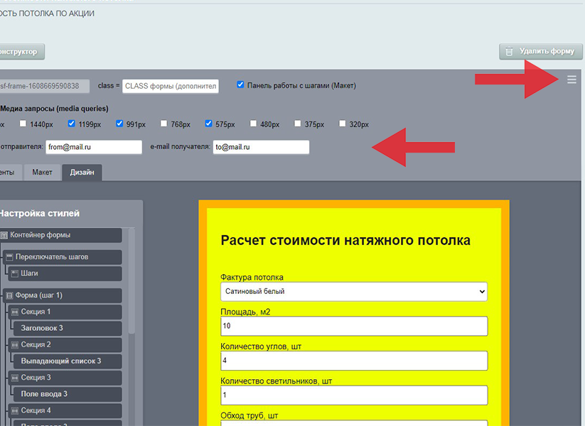 | Элементы В конструкторе доступны: "формулы расчета", "поля ввода", "списки", "кнопки", "переключатели", "флажки", "загрузка файлов", "заголовки", "текст", "изображения", вставка html кода (включая style и javascript).