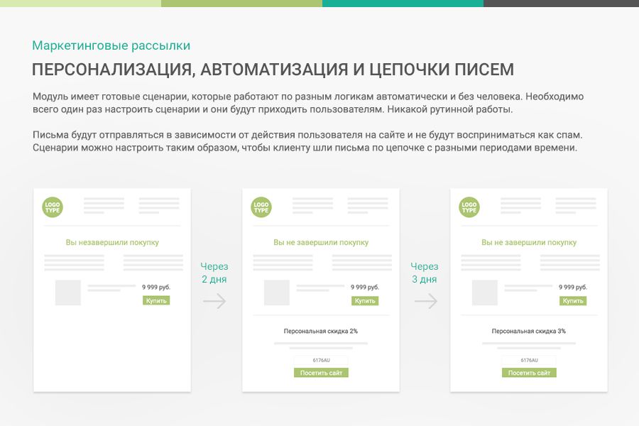 Модуль может работать с базой клиентов как в автоматическом режиме без участия человека по принципу “настроил и забыл”, так и в ручном режиме для уведомления клиентов о акциях. В поставку модуля входят стандартные сценарии отправки писем по категориям.