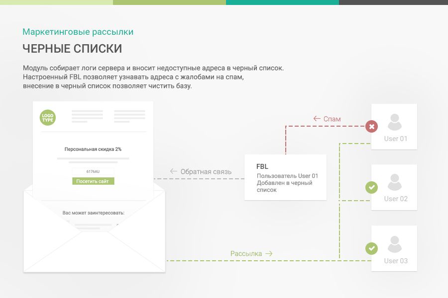 | - Триггерные рассылки. Автоматические персональные письма пользователям в зависимости от их действий на вашем сайте или CRM. - Гибкие ручные рассылки. Массовые рассылки по базам контактов в Битриксе с гибкой фильтрацией по инфоблокам, заказам, пользователям, подписчикам, корзинам и CRM. - Сбор подписной базы. В состав модуля входят компоненты для сбора подписчиков на сайте с различной логикой вывода. - Сегментация подписчиков. Группы пользователей и внутренние инструменты Битрикса позволяют гибко сегментировать базу. - Импорт подписчиков. Пополнение базы маркетинговых рассылок с помощью импортера из разных сущностей Битрикс. - Отписка от рассылки. Отказ от рассылки можно в один клик, подробная информация по отпискам в отдельном списке. - Черные списки. Сбор логов сервера для занесения почтовых ящиков недоступных для отправки письма, ручное занесение пользователей нажавших спам. - Статистика. Полная статистика по всем параметрам рассылки (открываемость, переходы, почтовые клиенты, количество заказов и т.д.). - PHP модификация. Каждую рассылку можно модифицировать с помощью PHP или создать абсолютно уникальный сценарий под свои потребности. |  |
